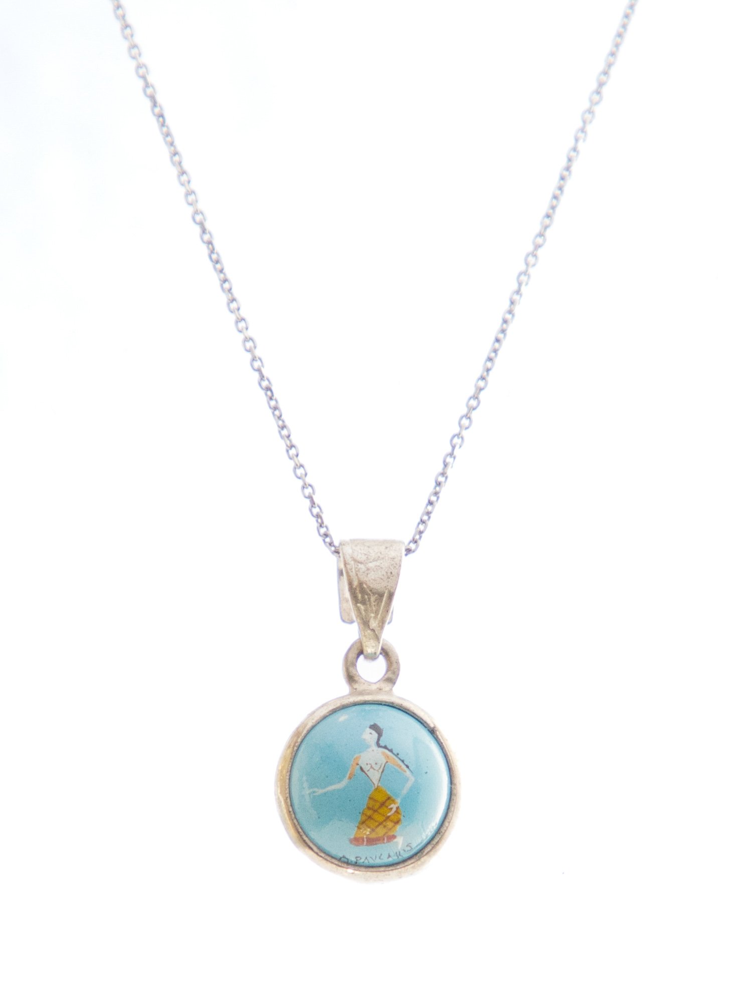 Representation of part of a fresco of a dance in a sacred grove with olive trees. Pendant painted with enamel on porcelain fired at 800 oC and silver 925.Chain included.