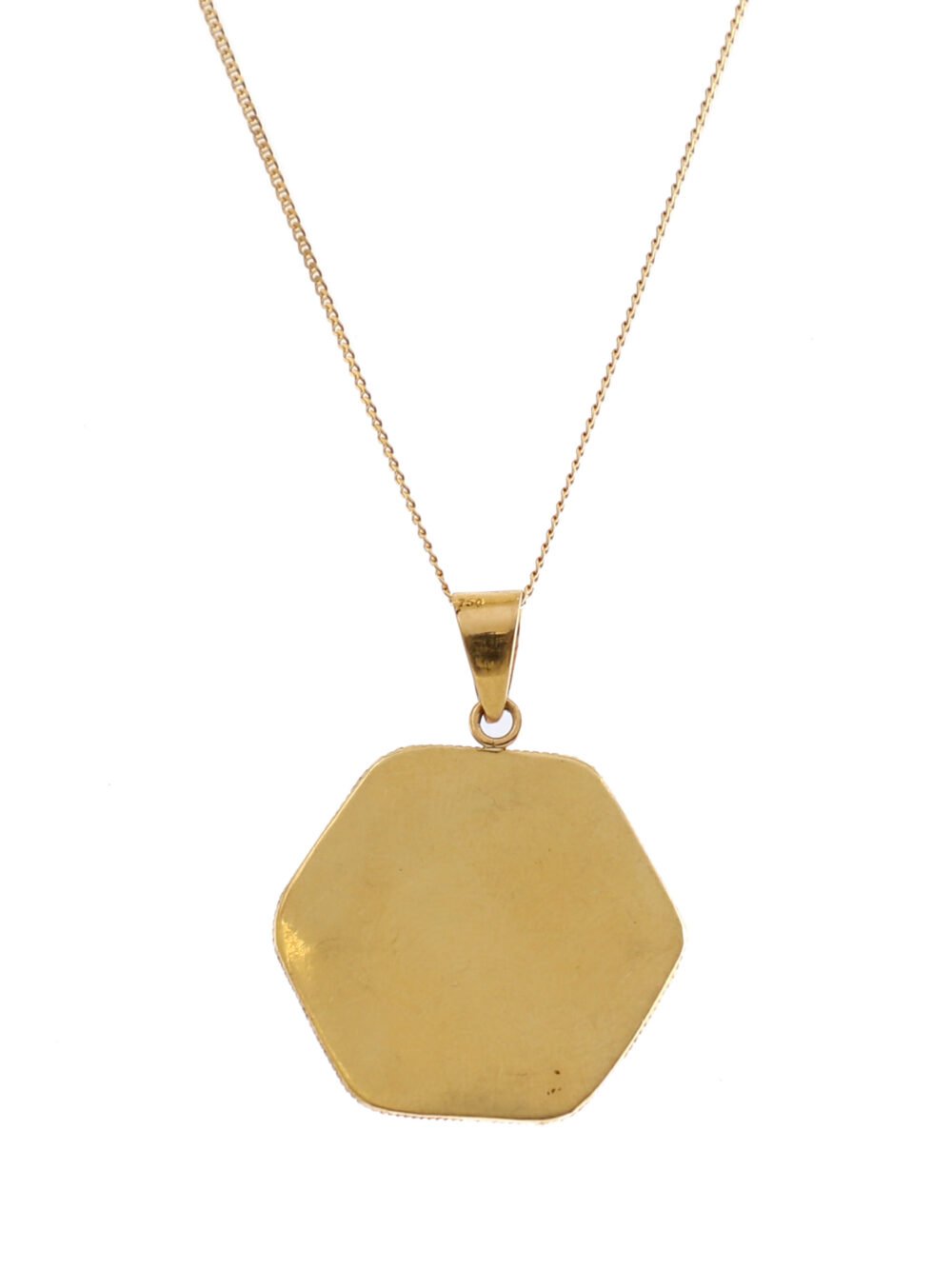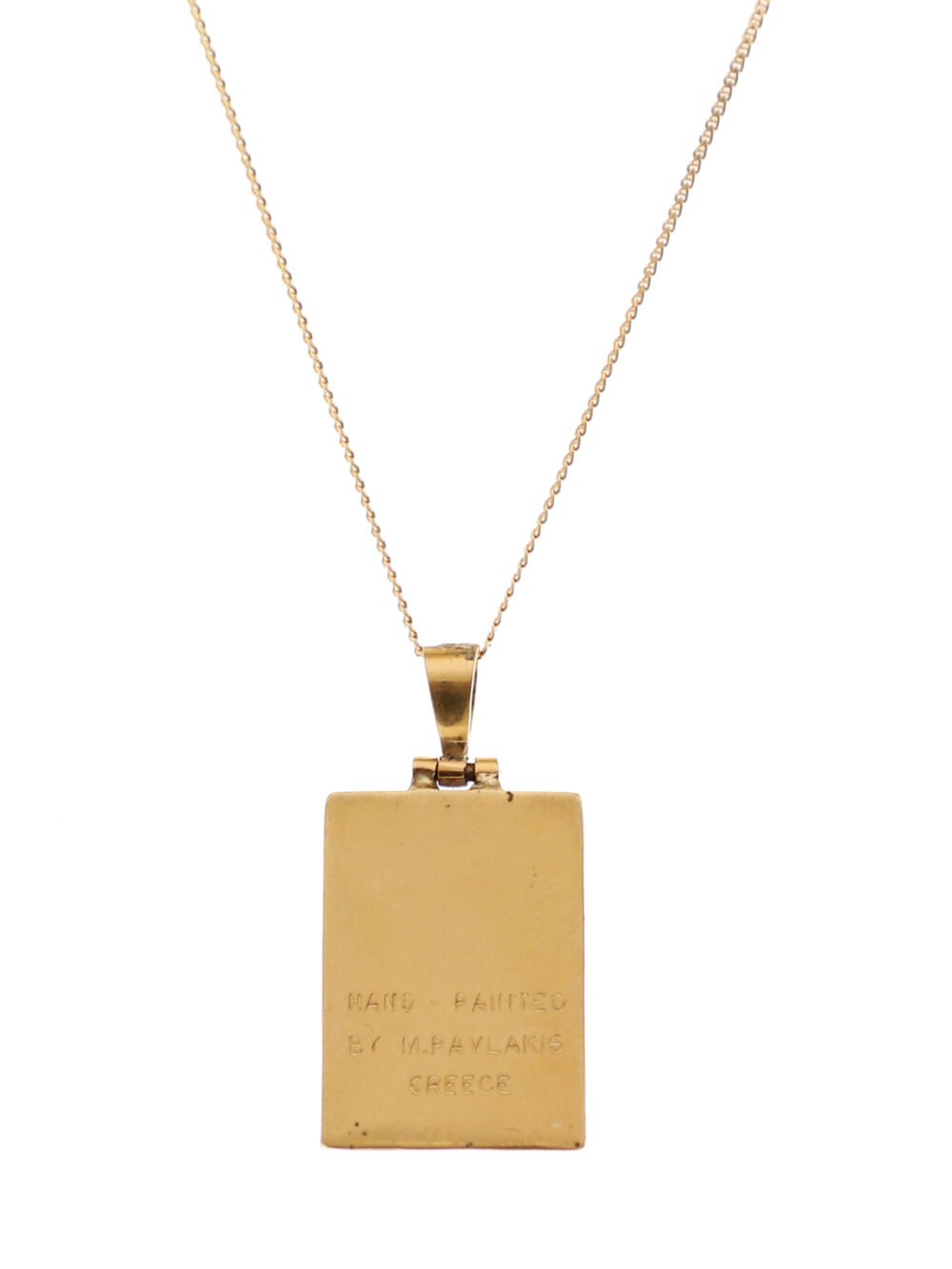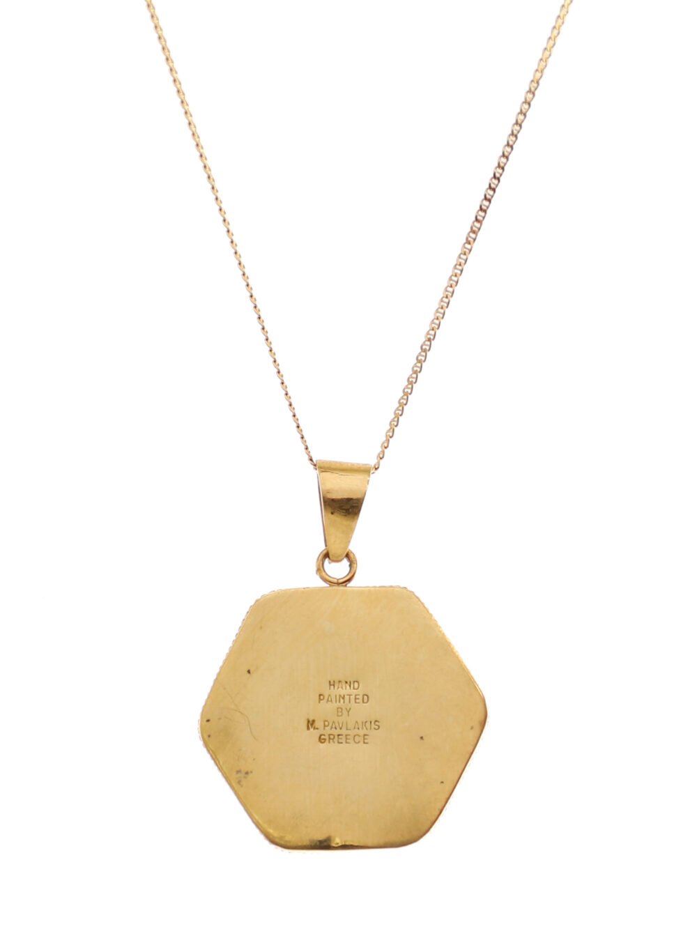 Απεικόνιση παράστασης από ένα χρυσό μικροσκοπικό σφραγιστικό δαχτυλίδι που βρέθηκε στις Αρχάνες, 1450-1400 π.Χ. Μενταγιόν ζωγραφιστό με σμάλτο πάνω σε πορσελάνη ψημένο στους 800 οC και δέσιμο με χρυσό 14Κ.Η αλυσίδα δεν περιλαμβάνεται. Διαστάσεις: 2 x 2,5 εκ.