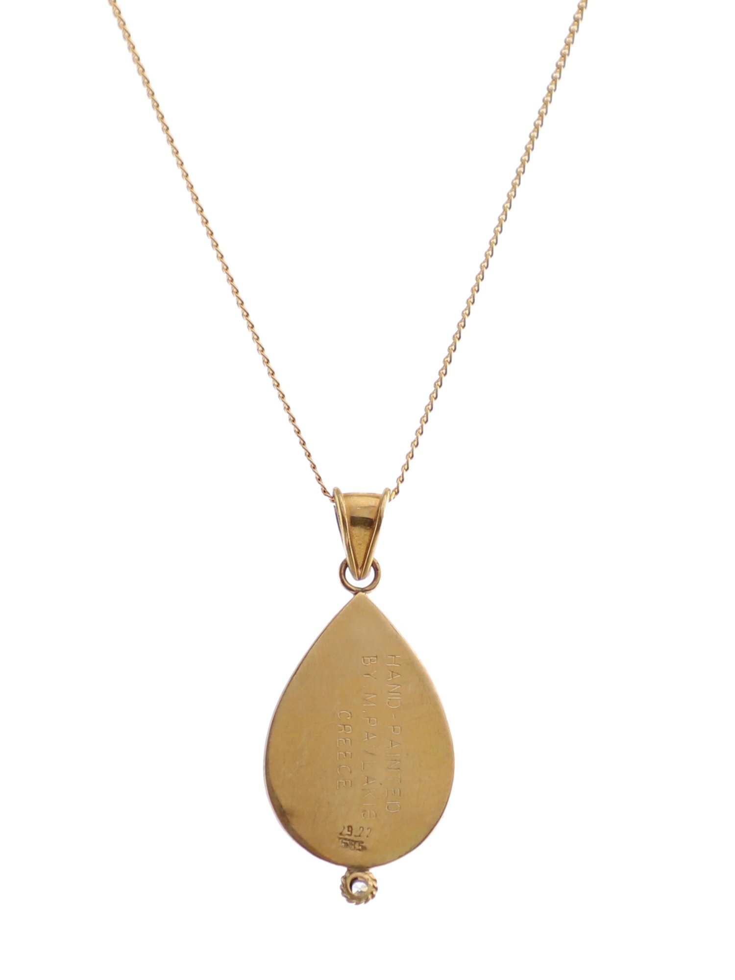 Ο Δίας μεταμορφωμένος σε ταύρο αρπάζει την Ευρώπη. Μενταγιόν ζωγραφιστό με σμάλτο πάνω σε πορσελάνη ψημένο στους 800 οC και δέσιμο με χρυσό 14Κ και brillant. Η αλυσίδα δεν περιλαμβάνεται.