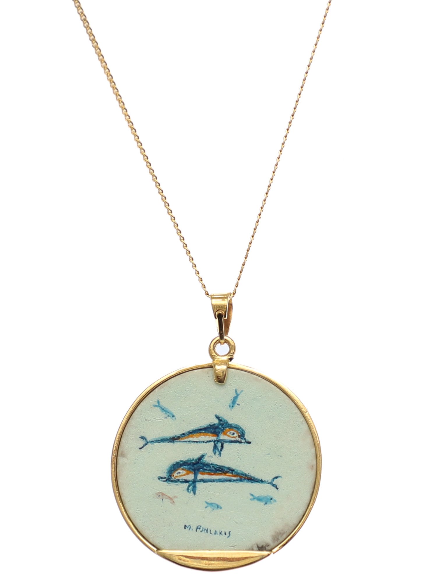 Διπλής όψης. Μενταγιόν ζωγραφιστό με σμάλτο πάνω σε πορσελάνη ψημένο στους 800 οC και δέσιμο με χρυσό 14Κ.Η αλυσίδα δεν περιλαμβάνεται.
